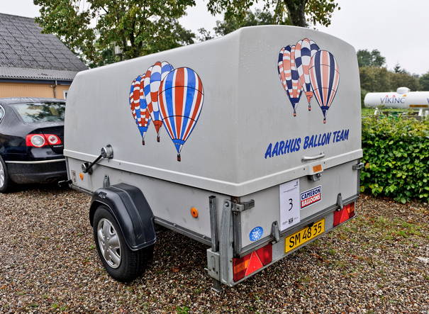 Traileren indeholder en varmluft ballon bestående af hylster (pakket i en stor blå sæk) og kurv med tilhørende gasbrænder og flasker.