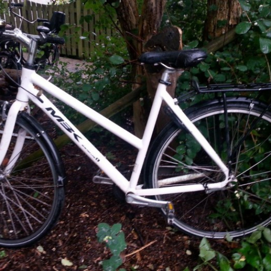 I busken foran huset har ligget en cykel de sidste to uger - den er meget sandsynlig stålet og efterladt |