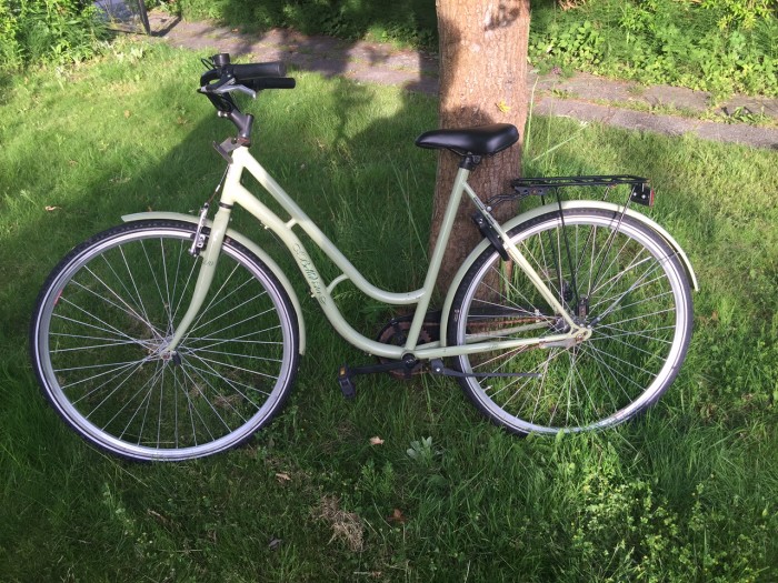 | Cyklen blev fundet i haven stående op af et træ. | |