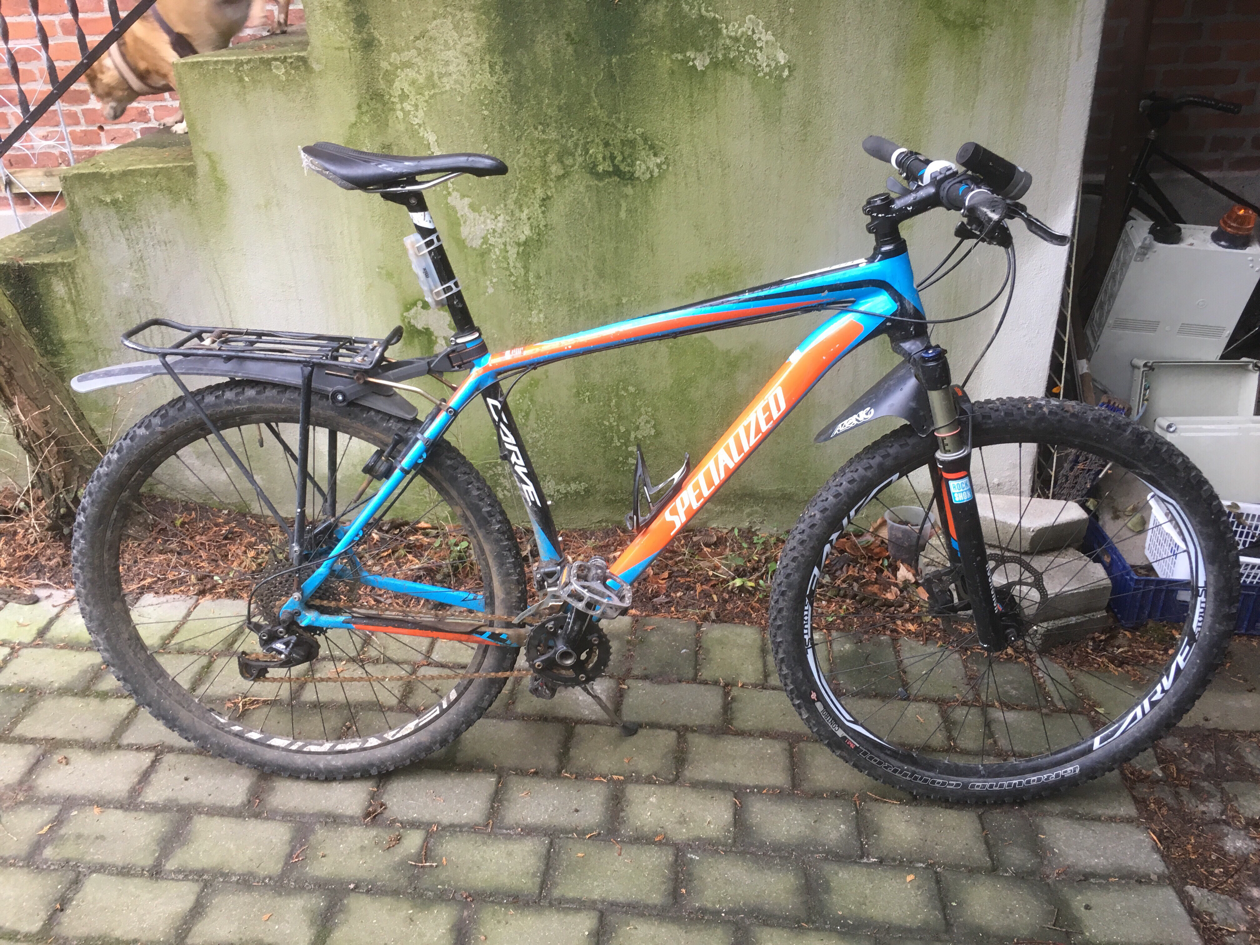 Mountainbike med bagagebærer blå og orange stel.
