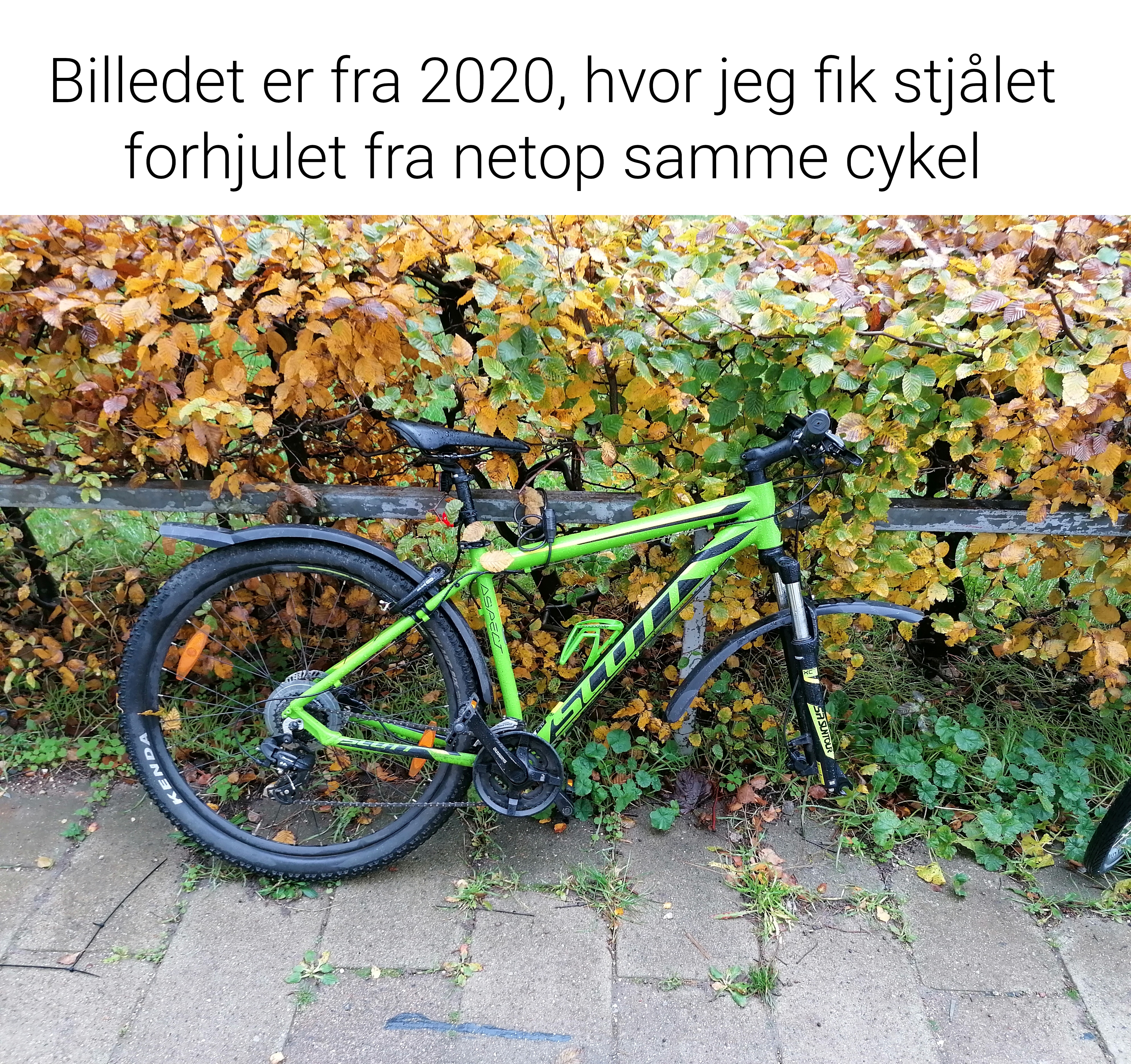 | Der går en sti fra mellem nummer 10 og 14 og ud til fodboldbanerne. Op af bygning 14 står der et birketræ, hvor min cykel netop stod låst fast til et cykelstativ. | |