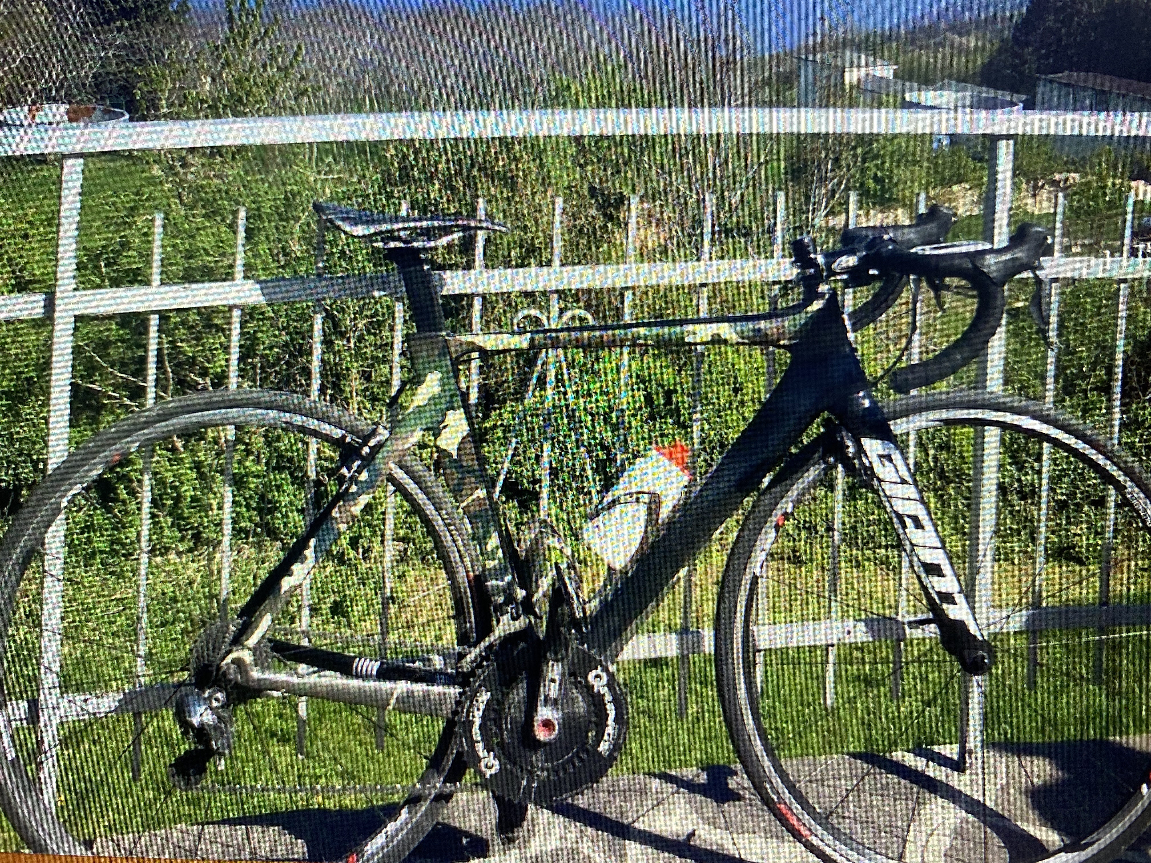 Det er en Giant Propel Advanced 0 med Shimano Ultegra Di2, som oprindeligt ser ud som vist på billedet. Dog har min cykel fået lavet camouflagefarvet folie, som I kan se på det andet billede.