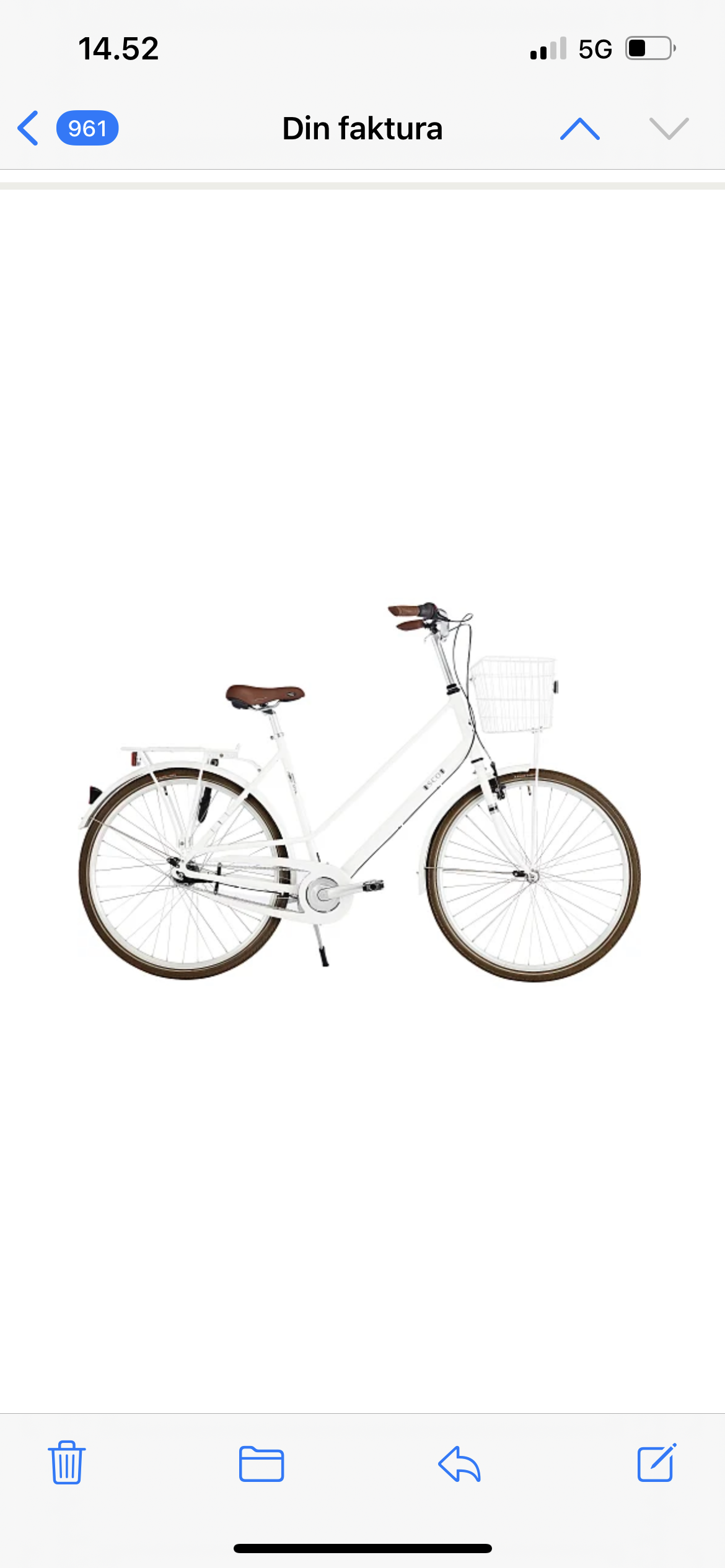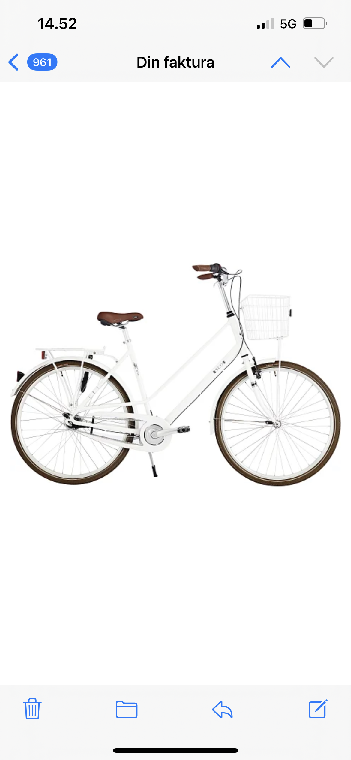 Hvid/creme damecykel, brun sæde og håndtage, hvid kurv foran cyklen, den er blot 4 måneder gammel og en sort tyk kædelås.