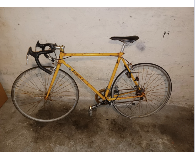 Min gule racercykel, har bjarne riis med gule bogstaver på. Den har en klip på skærm bag på baghjulet. Sadlen er en velo sadle, har dsv ikke stelnummeret. **Billedet er fundet på nettet, og har derfor andet styr, samt bagskærm på**