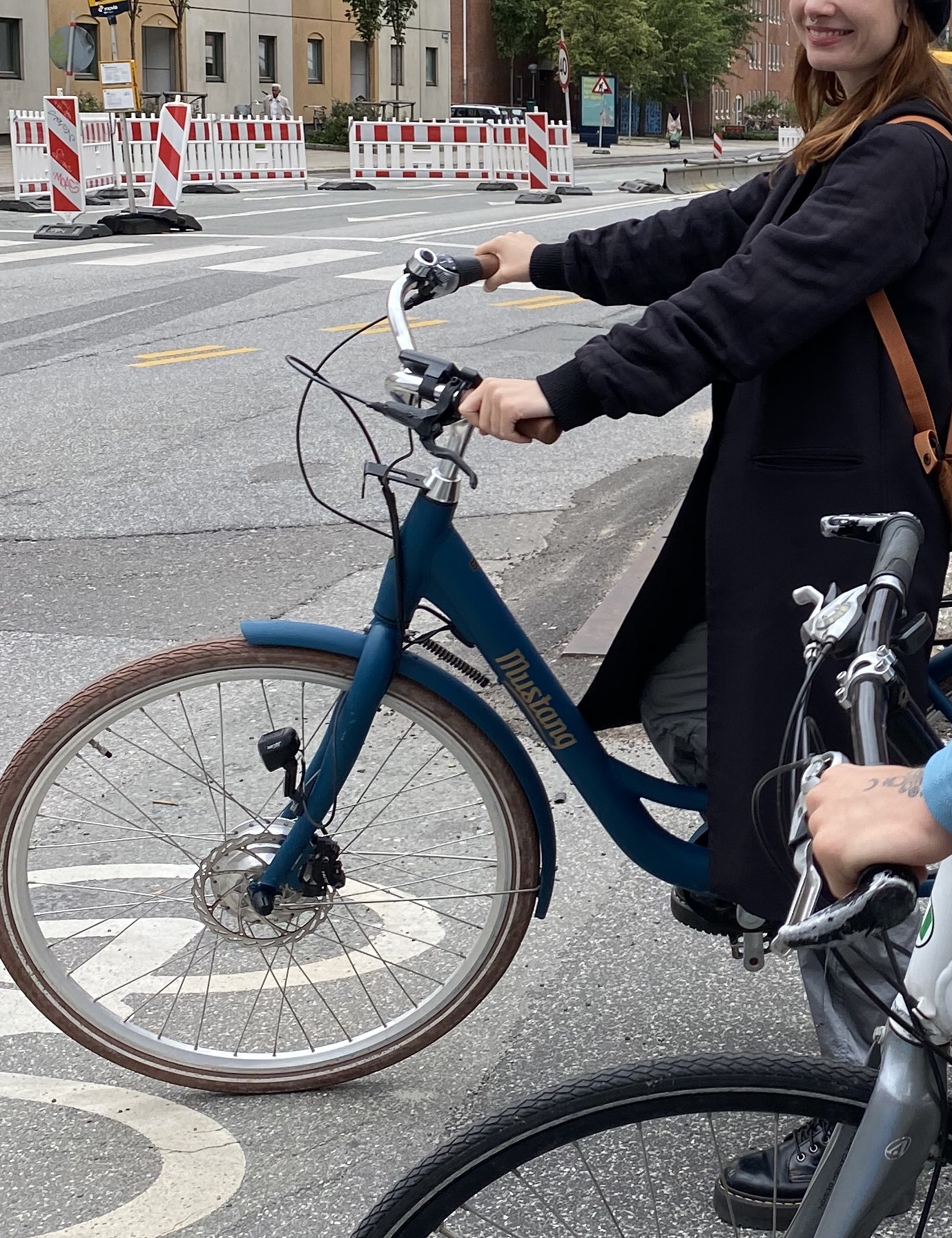 | Min el-cykel holdt parkeret på gaden foran min lejlighed. | |