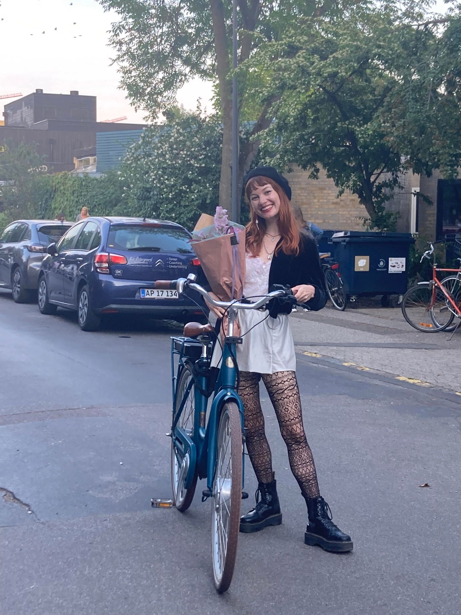 | Min el-cykel holdt parkeret på gaden foran min lejlighed. | |