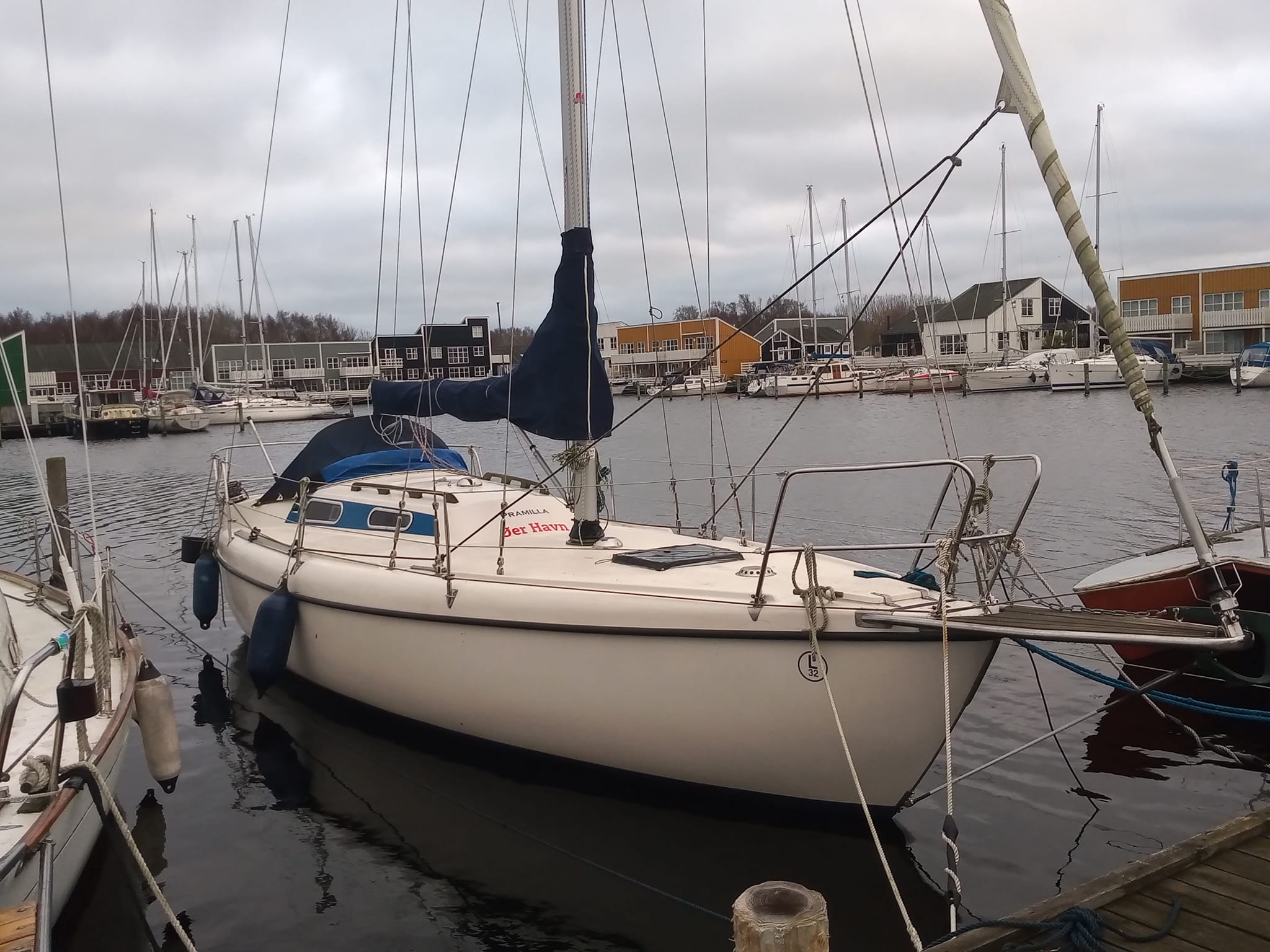 | Sejlbåd med hvidt skrog Pramilla Øer sat på ruf med rød skrift |