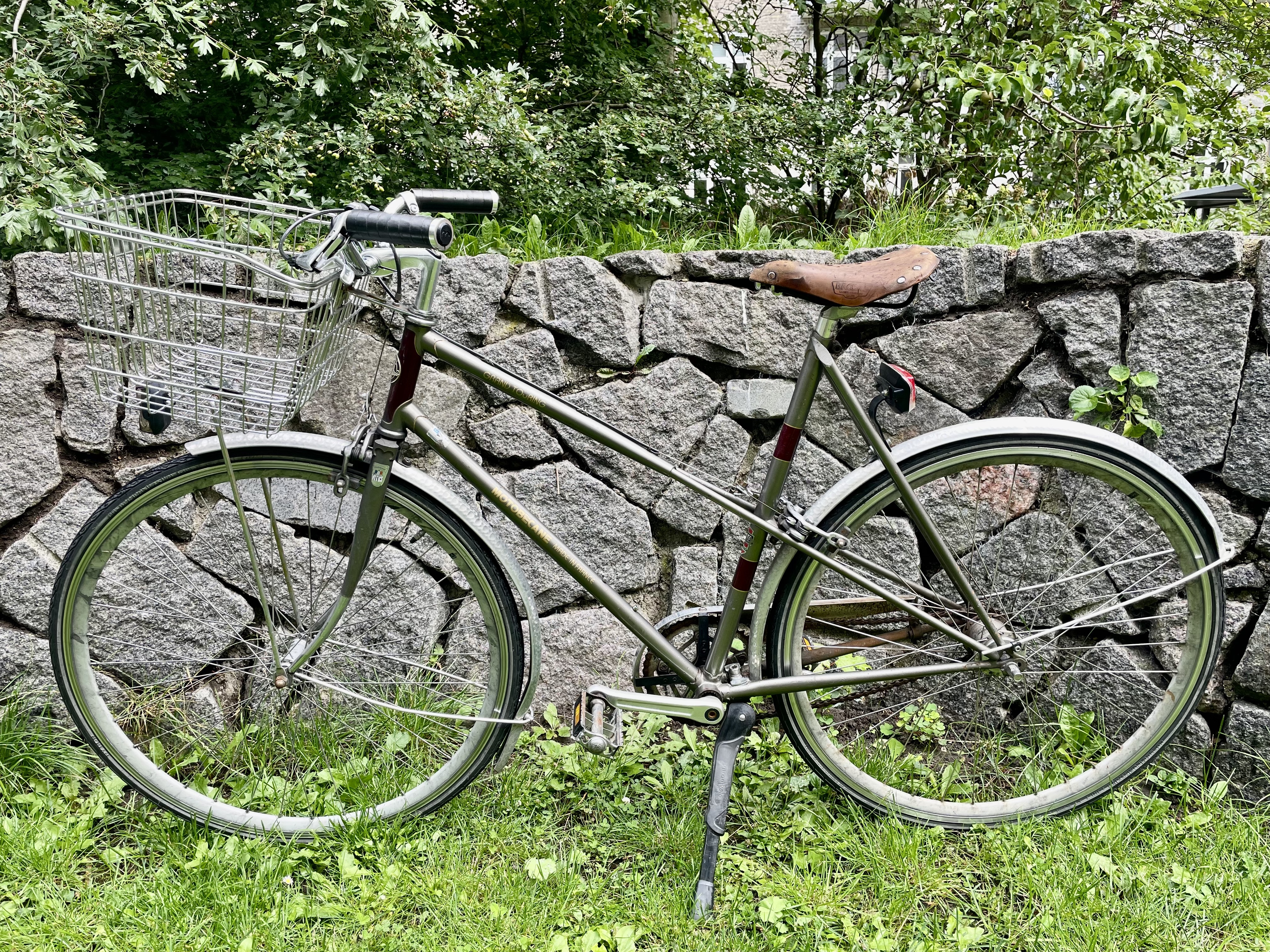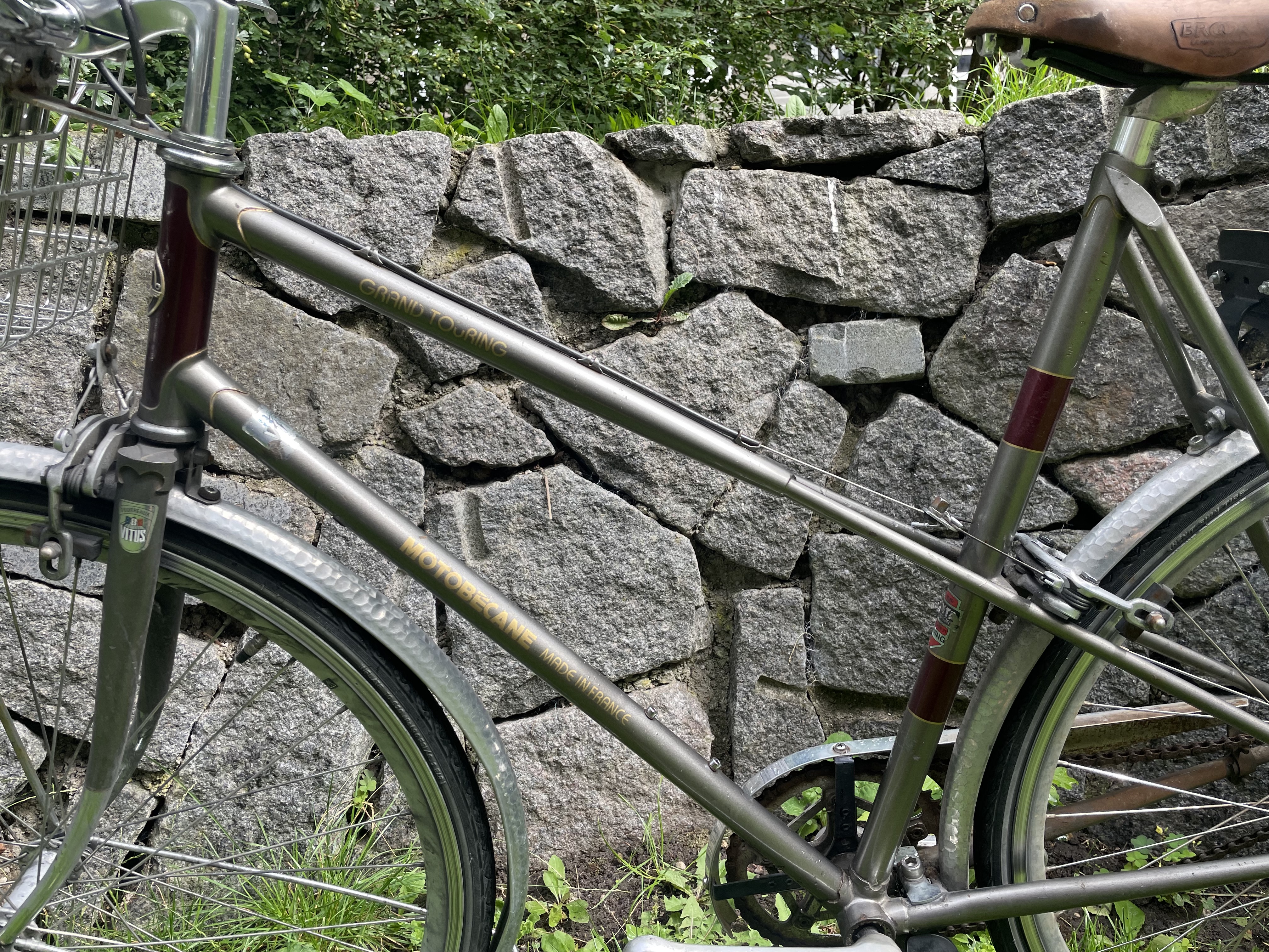 Fin Motobecane mixte med lygter for- og bagtil, kurv, hammerslåede skærme, dog er den ene skærm knækket bagpå